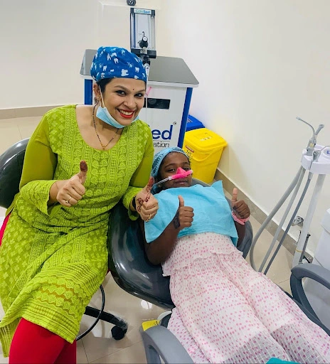 • Our chief Dentist is trained in nitrous oxide ( laughing gas ) sedation technique also in general anaesthesia sedation technique. Both are used to calm a highly anxious child before a dental procedure.